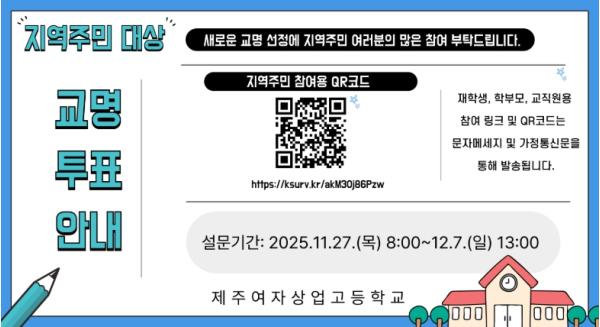 제주도교육청 제주여자상업고등학교는 2027학년도 일반고(남녀공학) 전환에 따라 실시한 학교명 공모 결과를 심사해 최종 3개 후보를 선정하고 이에 대한 온라인 설문조사를 27일부터 내달 7일까지 진행한다.