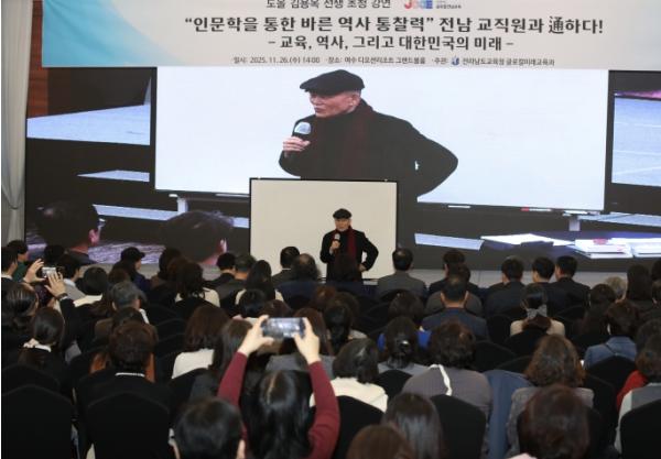 전라남도교육청이 26일 여수 디오션리조트에서 개최한 인문학 강연회에서 도올 김용옥 선생은 AI 시대의 교육이 나아가야 할 방향을 이같이 제시했다. ‘교육,역사, 그리고 대한민국의 미래’를 주제로 한 이번 강연에는 전남 초·중·고 교직원과 학부모 500여 명이 참석해 관심을 모았다.
