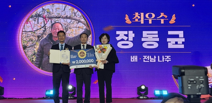 나주시에 따르면 지난 27일 대전컨벤션센터에서 열린 ‘2025 대한민국 과일산업대전 대표과일 선발대회’에서 세지면 장동균 농가가 신품종 배 품목으로 최우수상인 장관상을 수상했다.