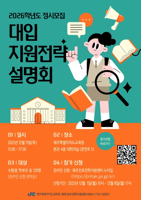 제주특별자치도교육청은 12월 11일 오후 3시부터 본관 4층 대회의실에서 ‘2026학년도 대입 정시모집 지원전략 설명회’를 개최한다.