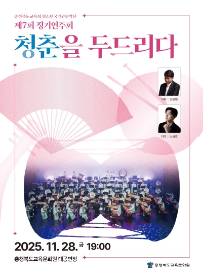 충청북도교육청 직속기관 교육문화원(원장 서종덕)은 28일 저녁 7시, 충북교육청 청소년국악관현악단이 교육문화원 대공연장에서 제7회 정기연주회 '청춘을 두드리다'를 열었다고 밝혔다.