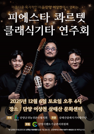 이번 연주회는 단양군귀농귀촌인협의회가 주최하고 단양시멘트기금관리위원회가 후원하며, 어상천에서 활동하는 삼태산 클래식기타 합주단이 주관한다. 귀농귀촌인협의회 박영자 회장은 “이번 공연이 단양의 문화예술 발전에 기여하고, 원주민과 귀농·귀촌인이 함께 어우러지는 화합의 장이 되길 바란다”며 “아름다운 클래식기타 선율을 통해 서로의 마음을 나누는 소중한 시간이 될 것이라 확신한다”고 소감을 전했다.