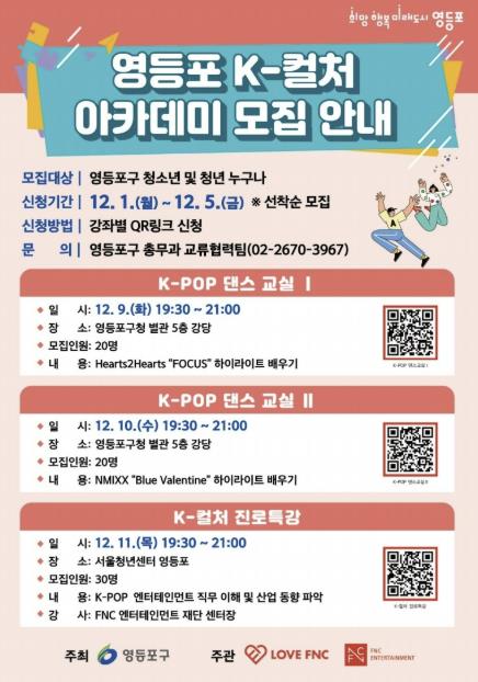영등포구가 글로벌 K-컬처에 관심 있는 청소년과 청년을 대상으로 ‘댄스교실’과 ‘진로특강’으로 구성된 ‘영등포 K-컬처 아카데미’를 운영하고, 참가자를 모집한다고 밝혔다.