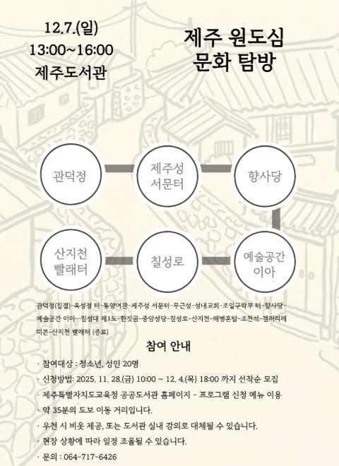 또한 ‘제주의 역사를 지켜본 관덕정 이야기’를 시작으로 ▲북두칠성 유래가 담긴 칠성로 ▲남문로와 이앗골 등 오래된 골목 이야기 ▲제주 사람들의 삶을 관통하는 산지천 ▲원도심 속 제주4·3의 흔적 등을 차례로 둘러보며 예혁 전문문화해설사가 강사로 동행해 깊이 있는 해설을 제공할 예정이다.