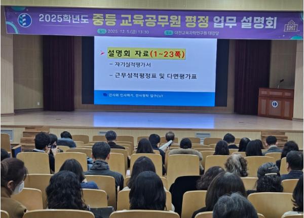대전시교육청은 12월 5일, 8일 양일간 대전교육과학연구원에서 중·고·각종·특수학교 교감과 교사, 교육전문직원을 대상으로 2025학년도 중등 교육공무원 평정 업무 설명회를 개최했다.