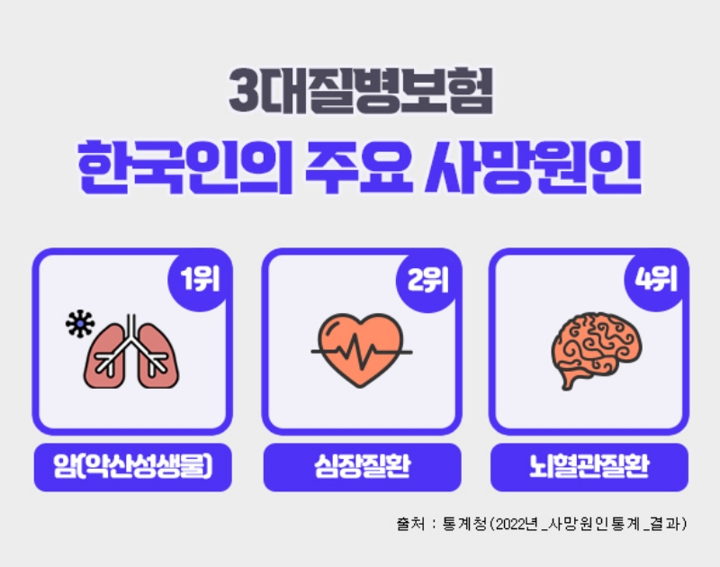 흔히 3대질병이라 일컫는 암, 심혈관질환, 뇌혈관질환은 통계청 발표자료에 따르면 한국인의 주요 사망원인 중에서 3위 폐렴을 제외하고 1~4위를 차지하고 있으며, 이전부터 지금까지도 살면서 가장 먼저 대비해야 하는 치명적인 질병으로 강조되고 있다. 이러한 중대질병에 대비하기 위하여 상기 세가지 치명적인 질병을 집중보장하는 3대질병진단비보험을 많이 가입하고 있다. 3대진단비보험은 각각의 질병을 중점적으로 보장하면서도 가입자 특성에 맞는 특약을 추가함으로써 종합건강보험으로도 활용할 수가 있다.