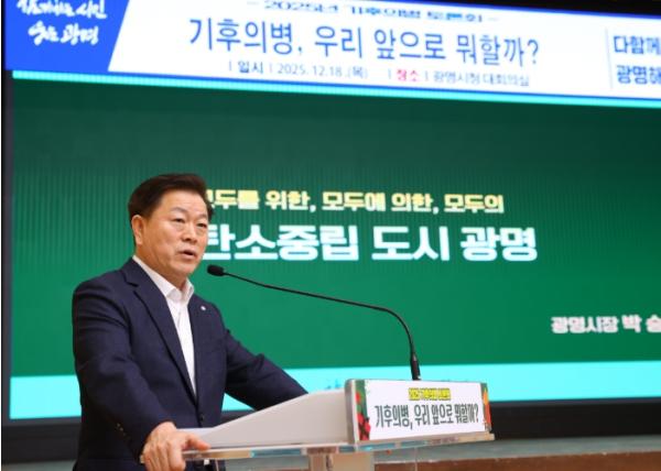 이날 박승원 광명시장은 ‘모두를 위한, 모두에 의한, 모두의 탄소중립 도시 광명’을 주제로 강의하며, 광명시가 추진해 온 탄소중립 정책의 흐름과 기후의병의 역할을 설명했다.