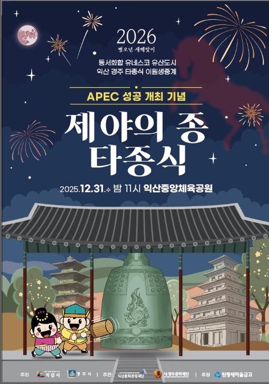 시 관계자는 "이번 제야의 종 행사는 익산과 경주의 공동 성과를 기념하고, 시민과 함께 새해 희망을 나누는 상징적인 자리"라며 "2026년 병오년 새해를 따뜻한 마음으로 시작할 수 있도록 정성을 다해 준비하고 있는 만큼 많은 관심을 부탁드린다"고 당부했다.