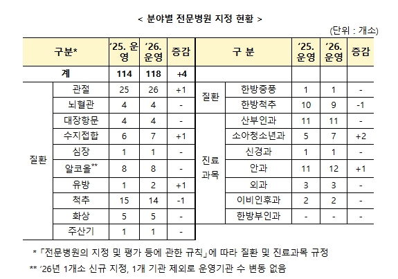 제5기 3차년도 전문병원 지정에 따라, 2025년 114개에서 2026년에는 118개 전문병원을 지정·운영하게 된다.