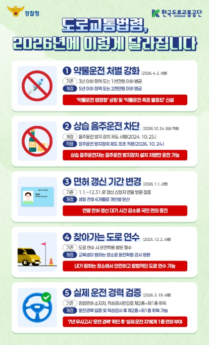 또한, 상습적인 음주운전 행위를 근절하고자, 최근 5년 내 2회 이상 적발된 위반자가 결격 기간 종료 후 면허를 재취득하면 차량에 ‘음주운전 방지장치’를 부착해야만 차량 운전이 가능한 조건부 면허 제도를 2026년 10월부터 본격적으로 시행한다.