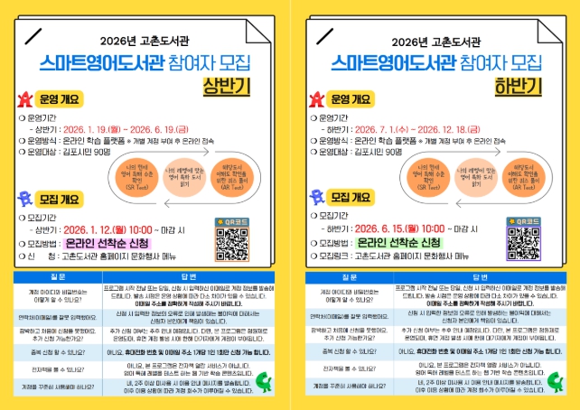 김포시 고촌도서관이 2026년 1월 19일부터 12월 18일까지 ‘2026년 스마트영어도서관’을 운영한다.