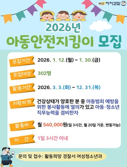 부산시 자치경찰위원회는 부산경찰청과 함께 오는 1월 12일부터 1월 30일까지 '2026년 아동안전지킴이'를 모집한다고 밝혔다.