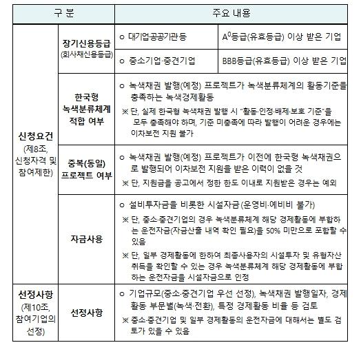 이번 지원사업은 지난해(2025년) 12월 말에 개정된 한국형 녹색분류체계를 반영하여 차세대 저탄소 기술을 폭넓게 지원하고, 자금 지원범위도 넓혀 기업의 수요에 부응하는 탈탄소 투자를 촉진한다.