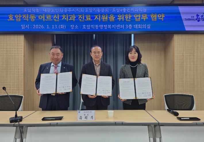 충주시 호암직동행정복지센터(동장 김민남)는 13일 대한노인회 충주시지회 호암직동분회(분회장 유덕상), 호암e좋은치과의원(원장 유희복)과 관내 어르신들의 건강 증진과 의료 접근성 향상을 위한 진료협력 협약을 체결했다.