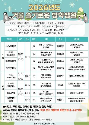 광주시교육청중앙도서관은 겨울방학을 맞아 오는 27일부터 2월 6일까지 초등학생을 대상으로 ‘겨울 슬기로운 방학생활’을 운영한다.