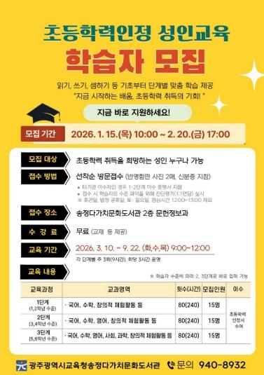 광주시교육청송정다가치문화도서관은 ‘2026학년도 초등학력인정 성인교육’ 프로그램을 운영한다.