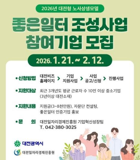 대전시는 1월 21일부터 2월 12일까지 대전형 노사상생 모델‘2026년 좋은 일터 조성사업’에 참여할 12개 기업을 공개 모집한다.