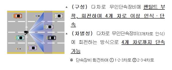 ‘다차로 단속장비’란 편도 3차로 이상의 도로에서 최소 3개 차로를 인식·단속하는 장비이며, 이 장비에 팬틸트(회전 카메라)를 부착하여 회전 기능을 활용하면 최대 4개 차로까지 단속할 수 있어 단속장비 1대 설치로 2대의 설치 효과를 낼 수 있다.