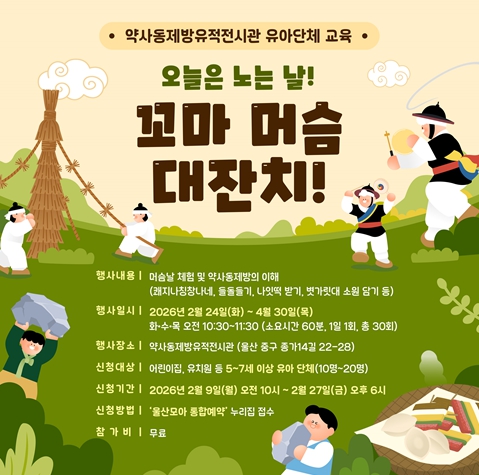 울산 약사동제방유적전시관이 관내 어린이집과 유치원 원아(5세~7세)를 대상으로 머슴날(음력 2월 1일)과 관련한 교육 프로그램 ‘오늘은 노는 날! 꼬마 머슴 대잔치!’를 운영한다.