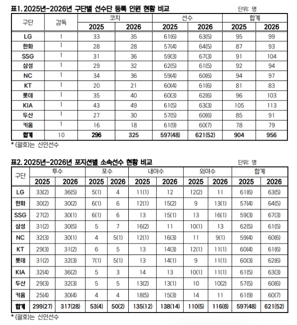 KBO는 2월 10일(화) 2026년 KBO 리그 소속 선수 명단을 공시했다. 10개 구단은 총 621명의 선수를 등록해, 597명이 등록했던 2025년보다 24명이 늘어났다.