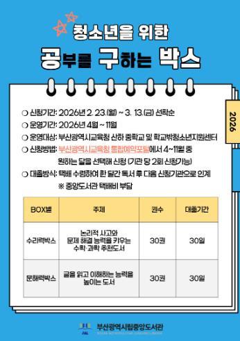 부산광역시립중앙도서관은 청소년의 문해력과 수리력 향상을 돕기 위한 도서 단체 대출 서비스인 ‘청소년을 위한 공·구박스(공부를 구하는 박스)’를 운영한다.