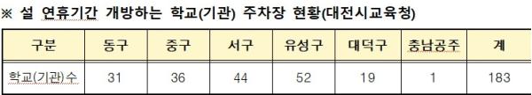 대전시교육청은 설 연휴 기간인 2월 14일부터 18일까지 대전을 찾는 귀성객과 지역 주민의 주차 편의를 위해 관내 각급 학교와 교육청, 산하기관 등 총 183곳의 주차장을 무료로 개방한다고 밝혔다.