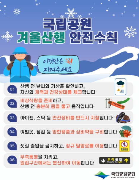 기후에너지환경부 산하 국립공원공단(이사장 주대영)은 2월 14일부터 18일까지 설 연휴 탐방객 안전관리 대책 기간으로 지정하고, 국립공원 주요 지역 1,544곳에 인력 4,833명을 집중 배치해 탐방객의 생명과 안전을 지키기 위한 현장 대응을 대폭 강화한다고 밝혔다.