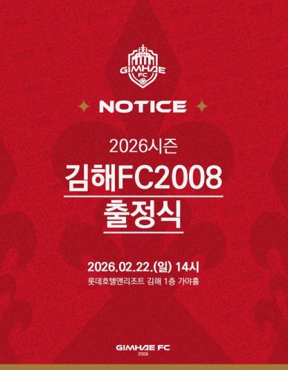 K리그2 무대에 첫 도전장을 내미는 김해FC2008(이하 김해FC)이 오는 22일 오후 2시, 롯데호텔앤리조트 김해에서 ‘2026시즌 출정식’을 개최한다.