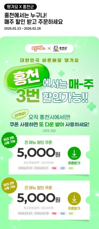 이번 이벤트는 신한은행 ‘땡겨요’ 사업단과의 공동 마케팅 협약을 바탕으로 추진됐으며, 공공배달앱 활성화를 통해 소상공인의 경영 부담을 완화하고 지역 경제의 활력을 회복하고자 마련된 홍천군 차원의 정책적 대응이다.