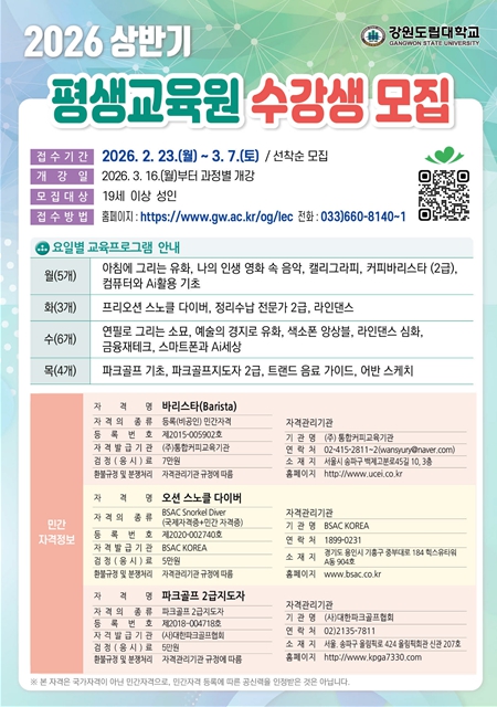 강원도립대학교는 2월 23일부터 3월 7일까지'2026년도 상반기 평생교육원 수강생'을 모집한다고 밝혔다.