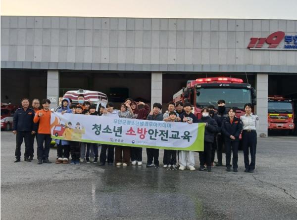 무안군 청소년방과후아카데미 청소년들은 지난 12일 무안소방서를 방문해 체험형 소방안전교육에 참여했다.