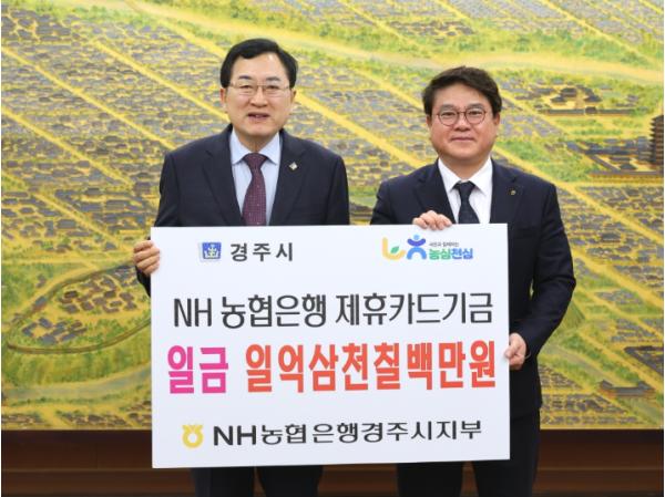 경주시는 25일 시청 대외협력실에서 NH농협은행 경주시지부(지부장 황대화)로부터 지난해 제휴카드 사용에 따른 적립기금 1억 3,715만 5,240원을 전달받았다.