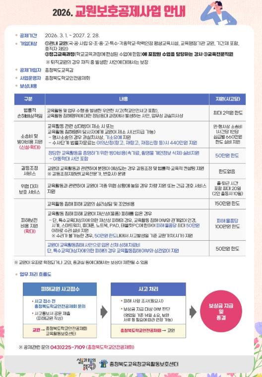 충청북도교육청은 교원이 안심하고 교육활동에 전념할 수 있도록 2026년 교원보호공제사업의 보장 범위를 확대해 시행한다고 밝혔다.