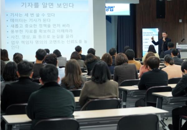 이날 교육에는 김호천 연합뉴스 취재본부 기자가 강사로 참여해 현장 경험을 바탕으로 언론의 시각에서 바라본 보도자료 작성 요령과 실제 기사 작성 과정 등을 소개했다.