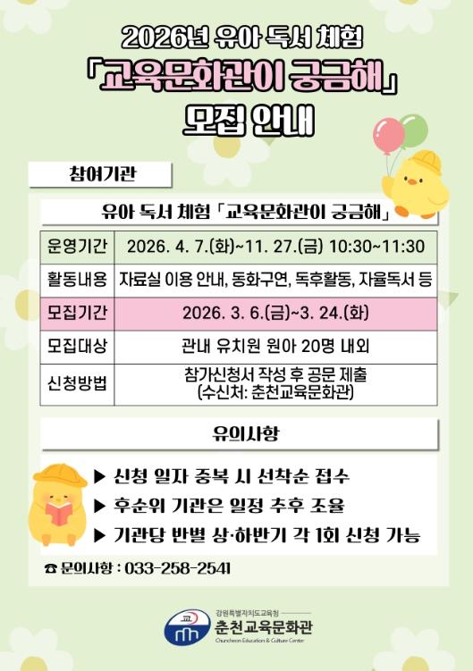 춘천교육문화관은 4월 7일부터 11월 27일까지 관내 유치원 원아를 대상으로 유아 독서 체험 프로그램 ‘교육문화관이 궁금해’를 운영한다.