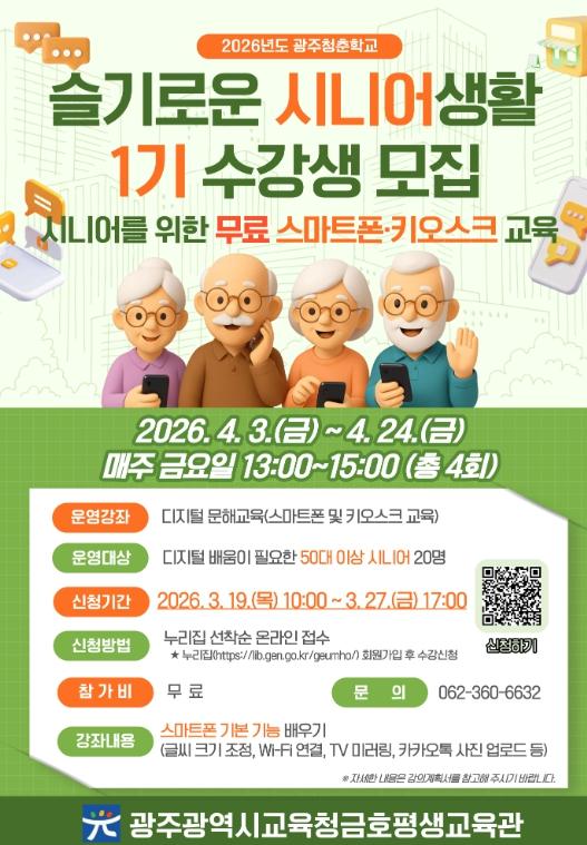 광주시교육청금호평생교육관은 오는 4월 3일부터 7월 31일까지 50대 이상 시니어를 대상으로 디지털 역량 강화 프로그램인 ‘2026 슬기로운 시니어생활’을 운영한다.