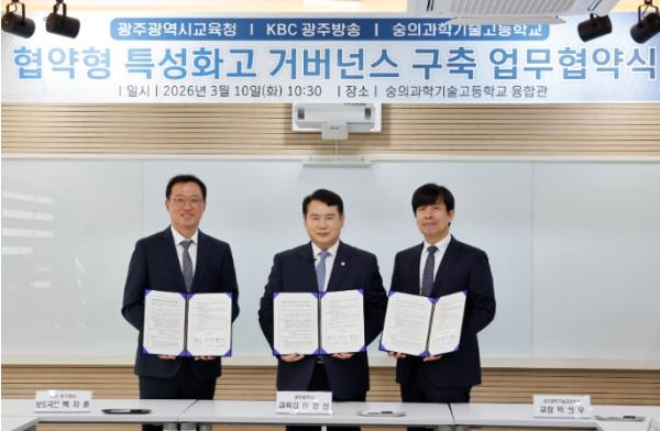 광주시교육청은 10일 숭의과학기술고등학교에서 KBC광주방송, 숭의과학기술고등학교와 함께 ‘협약형 특성화고 거버넌스 구축 업무협약’을 체결했다.