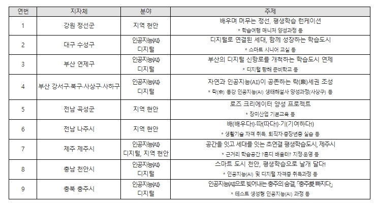 올해 교육부와 국가평생교육진흥원은 인공지능(AI) 대전환 시대 도래, 고령화·인구감소 등의 지역 현안 대응 등에 발맞춰, 기존 평생학습도시 201개(’25년 기준) 중 9개 평생학습도시를 지역의 색깔을 살린 ‘특성화 평생학습도시’로 거듭나도록 지원한다. 이번에 선정된 특성화 평생학습도시는 인공지능(AI)·디지털 학습, 지역 산업 참여, 세대 간 교류, 중장년 인재양성 등에 집중하여 평생교육을 지원할 계획이다.
