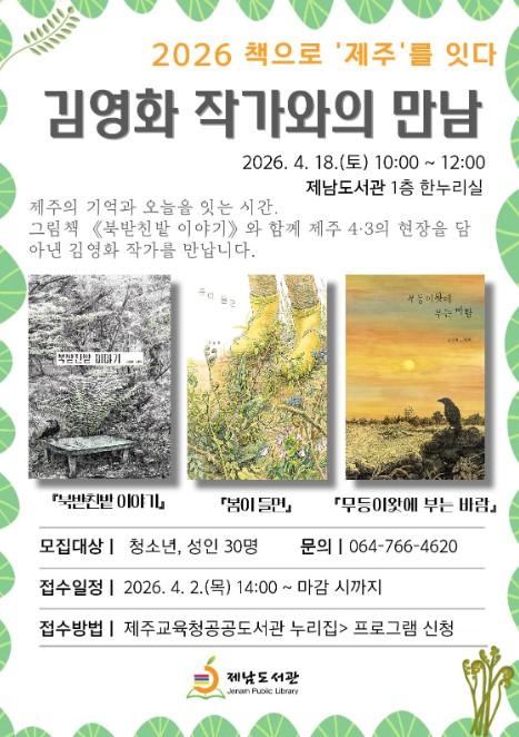 제주도교육청 제남도서관은 4월 18일 제남도서관에서 제주의 고유한 문화와 역사에 대한 이해를 높이고 지역에 대한 자긍심을 고취하기 위해 ‘2026 책으로 제주를 잇다–김영화 작가와의 만남’을 운영한다.
