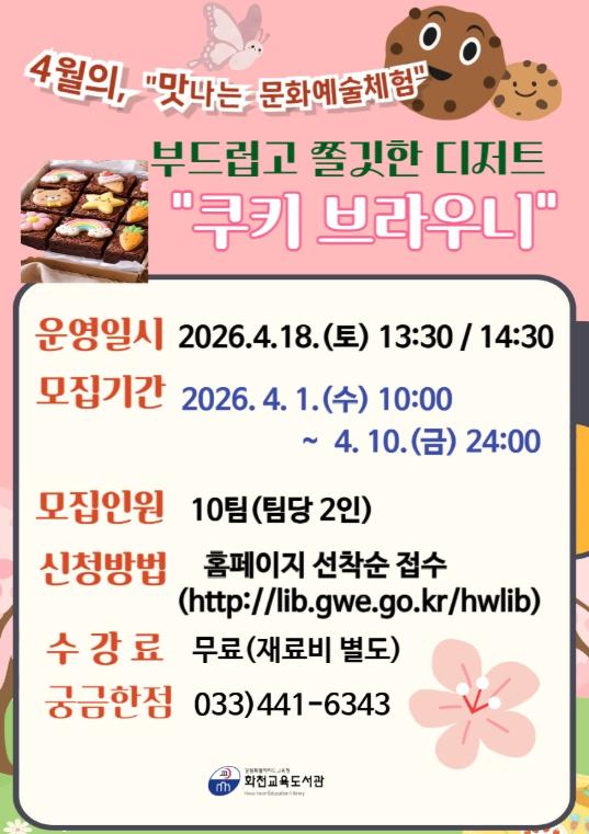 화천교육도서관은 지역주민을 대상으로 4월부터 11월까지 평생학습 주말 특강 ‘맛과 멋으로 함께하는 문화예술체험’을 운영한다.
