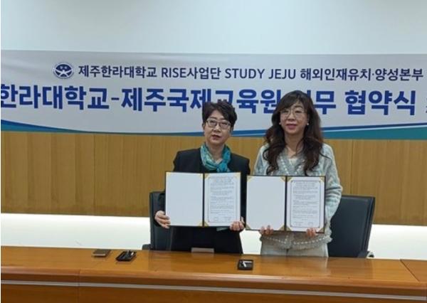 제주도교육청 주국제교육원과 제주한라대학교 지역혁신중심 대학지원체계(RISE)사업단은 1일 한라컨벤션센터에서 이주배경학생의 학교 적응과 학습 지원을 강화하고 외국인 유학생의 지역사회 참여 확대를 위한 업무협약을 체결했다.