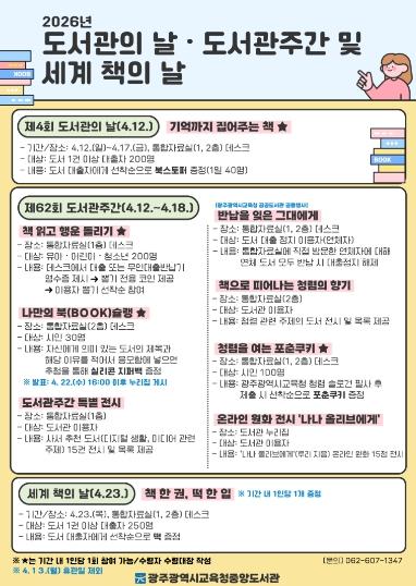 광주광역시교육청중앙도서관은 오는 12일부터 23일까지 본관 및 분관 최상준도서관에서 ‘도서관 속 작은 펼침, 세상을 여는 큰 열림’을 주제로 독서축제를 진행한다.