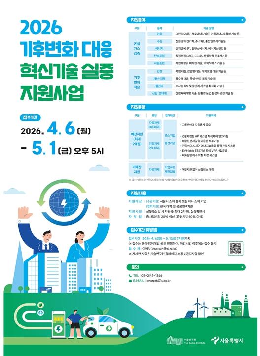 모집은 총 2개 분야로, 온실가스 감축 부문(건축, 수송, 에너지, 탄소포집, 자원순환)과 기후변화 적응분야(건강, 재난․재해, 물관리, 산림․생태계)이다. 시제품 제작 및 실용화가 가능한 제품 또는 서비스를 보유한 서울 소재 기업·대학·연구기관이라면 지원할 수 있다.