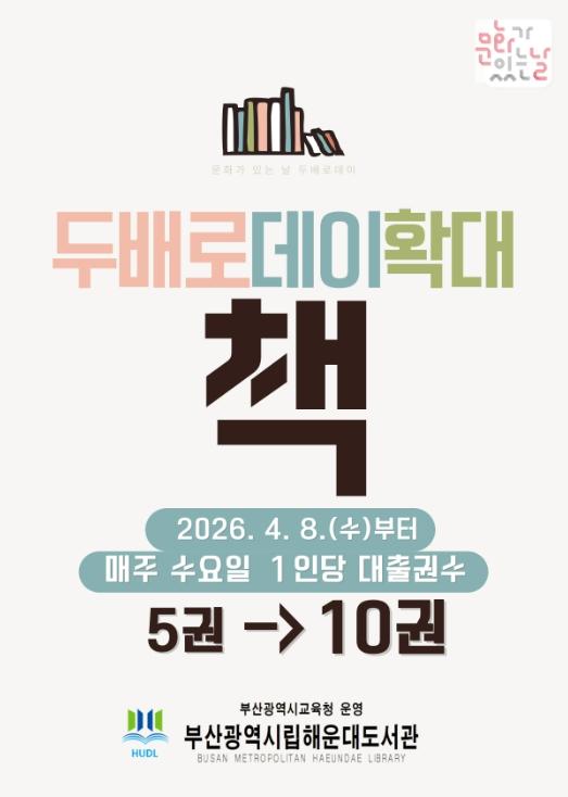 이에 따라 해운대도서관은 도서 대출 권수를 확대하는 ‘두 배로 데이’를 매주 수요일마다 운영한다.