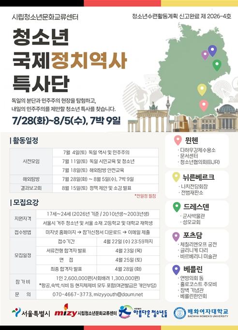 시립청소년문화교류센터(미지센터)가 주관하는 이번 프로그램에 선발된 12명의 청소년 특사단은 7월 28일부터 8월 5일까지 7박 9일간 독일 뮌헨, 뉘른베르크, 드레스덴, 포츠담, 베를린 등 5개 주요 도시를 방문한다.